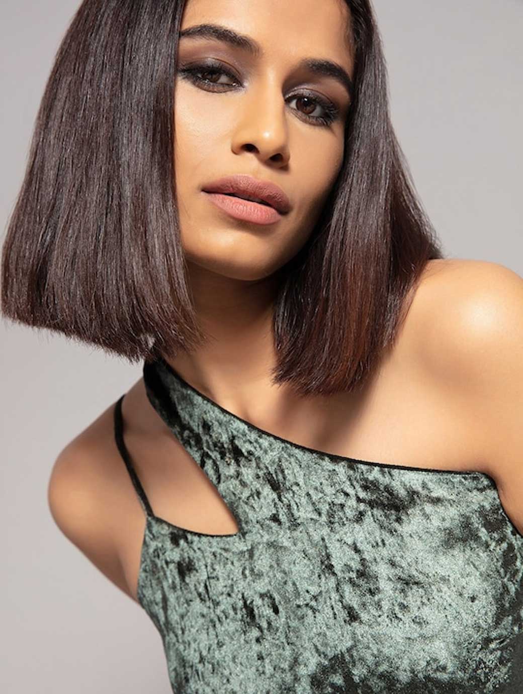 Green embellished sheath dress, One shoulder neck, Sleeveless, Knee length in straight hem, Velvet fabric, Concealed zip closure.