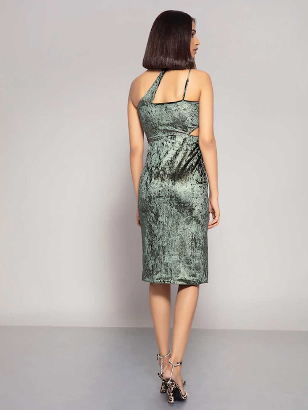 Green Embellished Velvet One Shoulder Sheath Dress