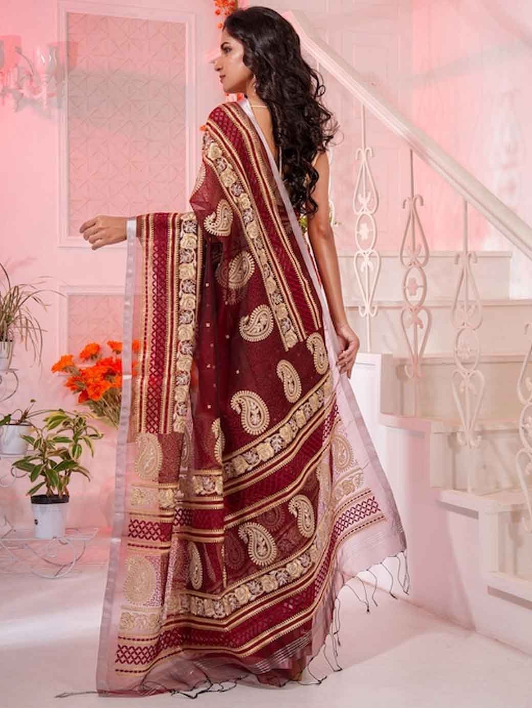 Maroon and gold-toned saree