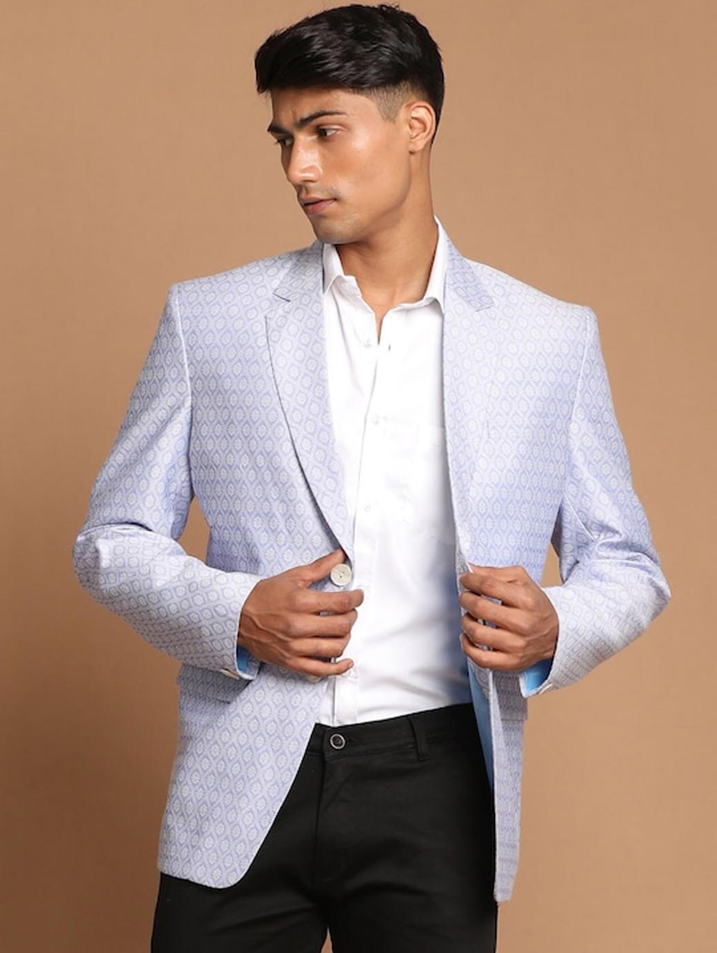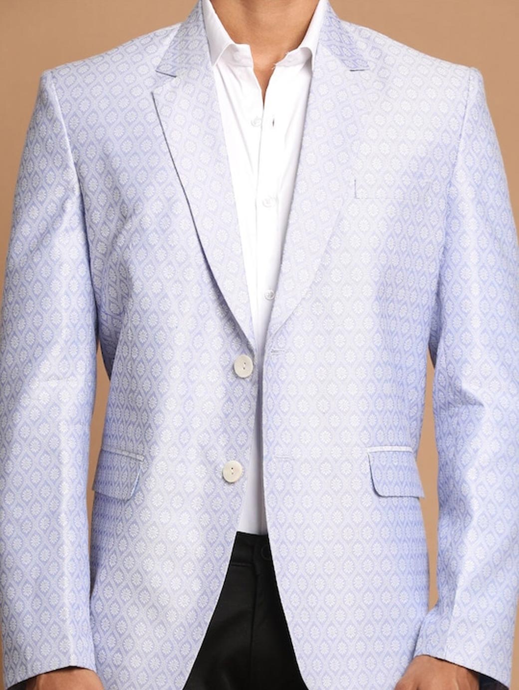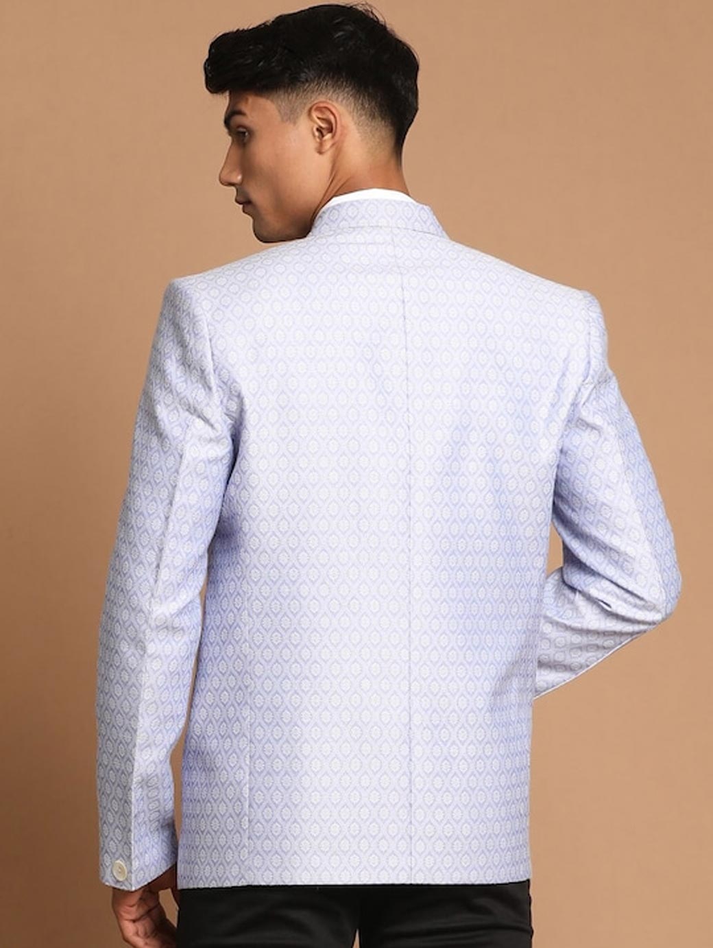 Lavender coloured self design regular-fit ethnic blazer, has a notched lapel, long sleeves, single-breasted with double button closure, two flap pockets, one welt pocket and a double-vented back hem