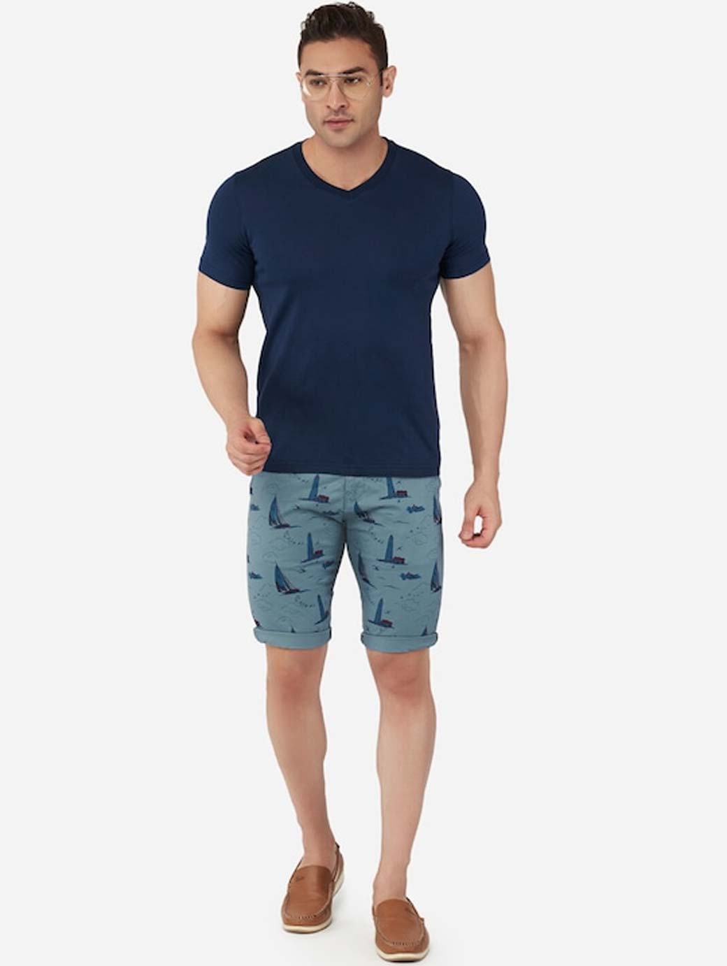Navy blue conversational printed mid-rise outdoor regular shorts, has 4 pockets, button closure