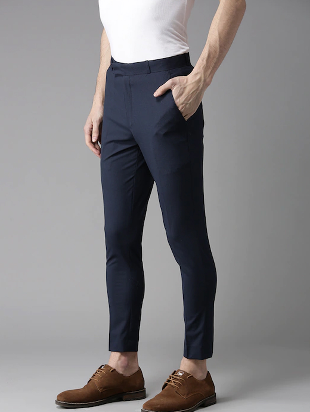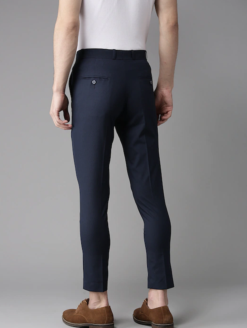 Navy Blue solid mid-rise trousers, has a hook and bar closure, four pockets