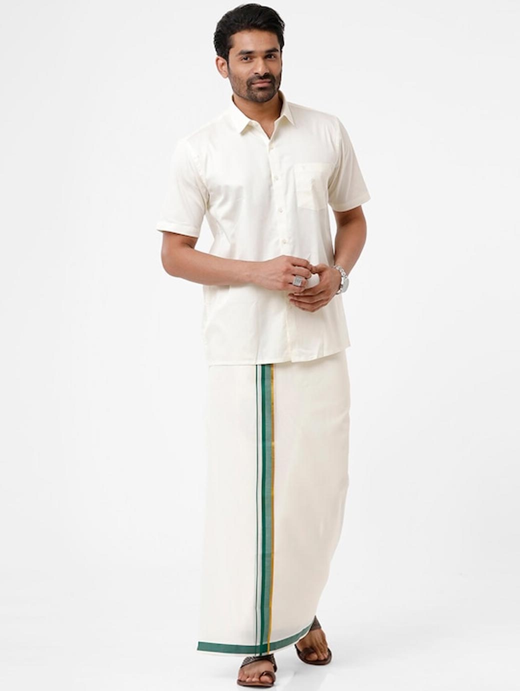 White solid mid-rise dhoti, has a green border