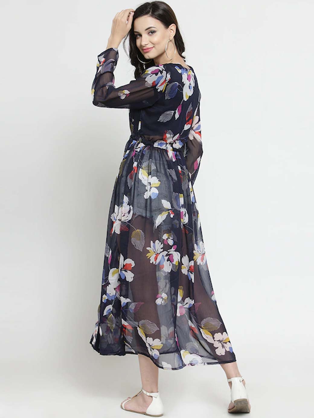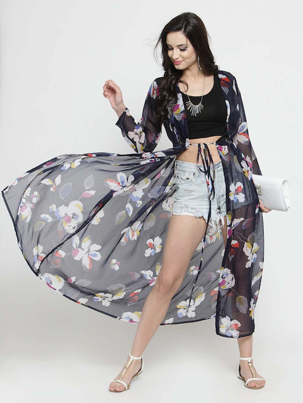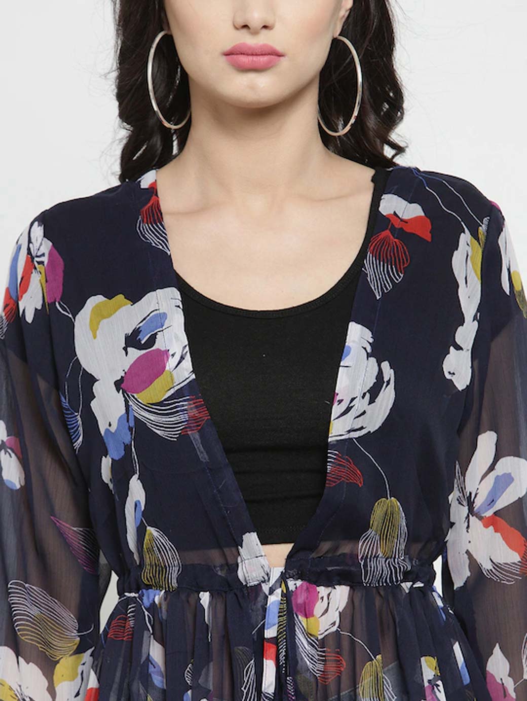 Navy Blue and white printed tie-up longline shrug, has long sleeves, gathers detail, straight hem
