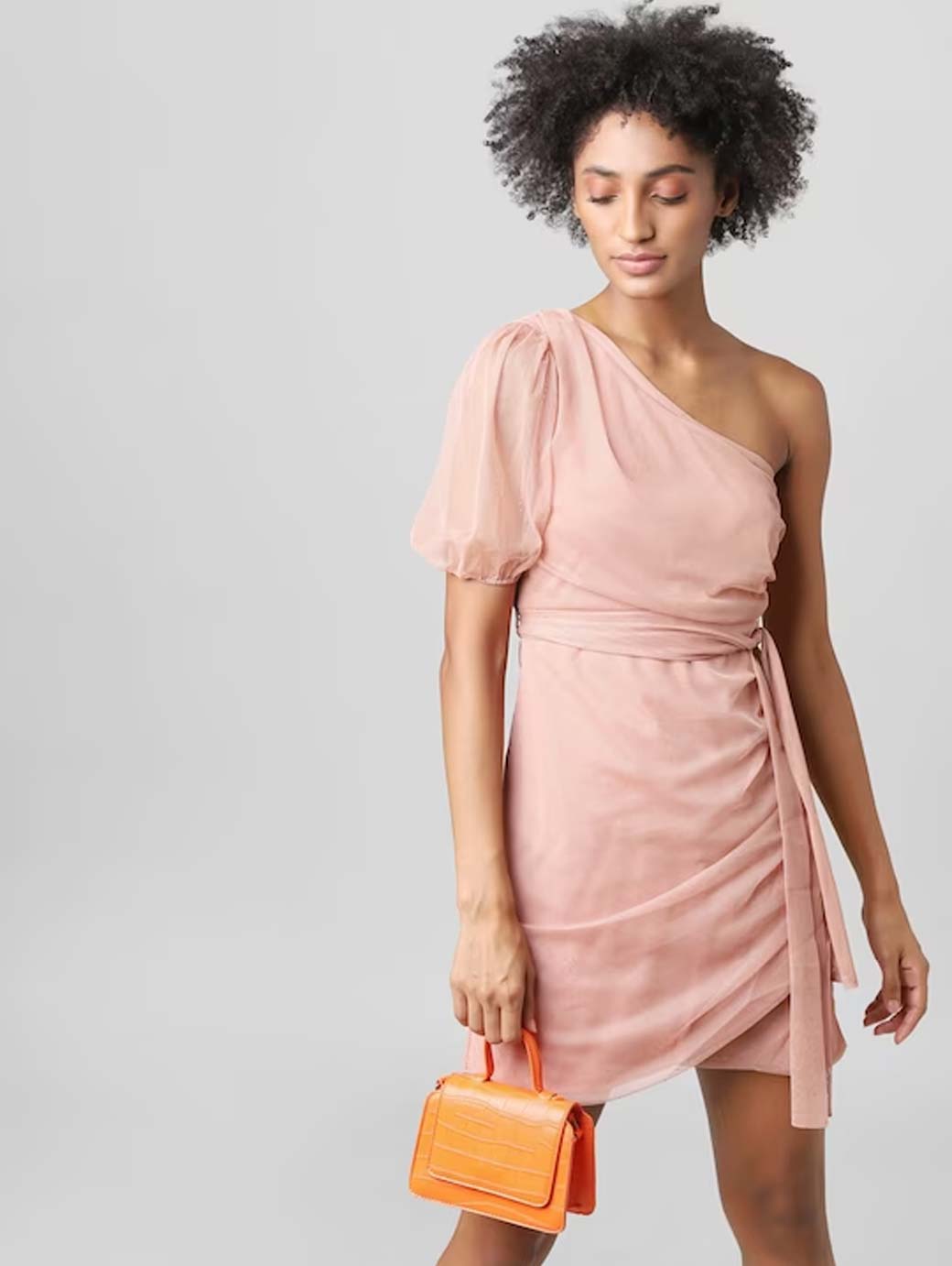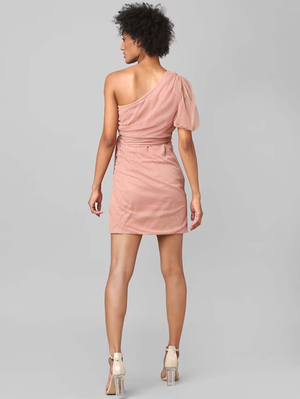 Women Pink Solid One Shoulder Mini Sheath Dress