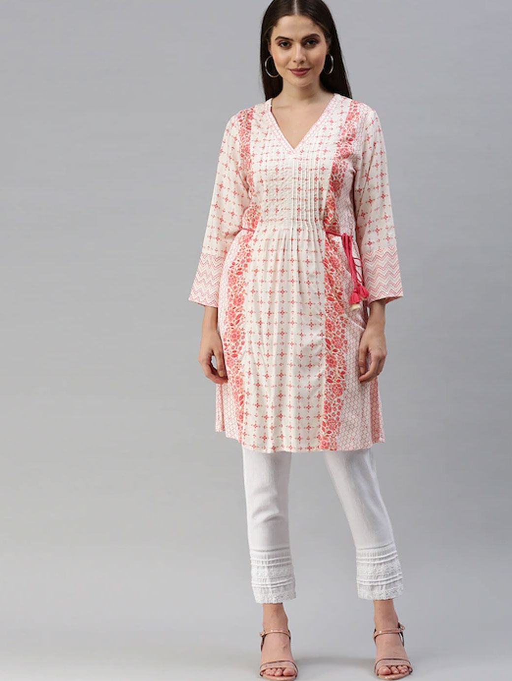 Off white and pink printed tunic, has a v-neck, three-quarter sleeves.