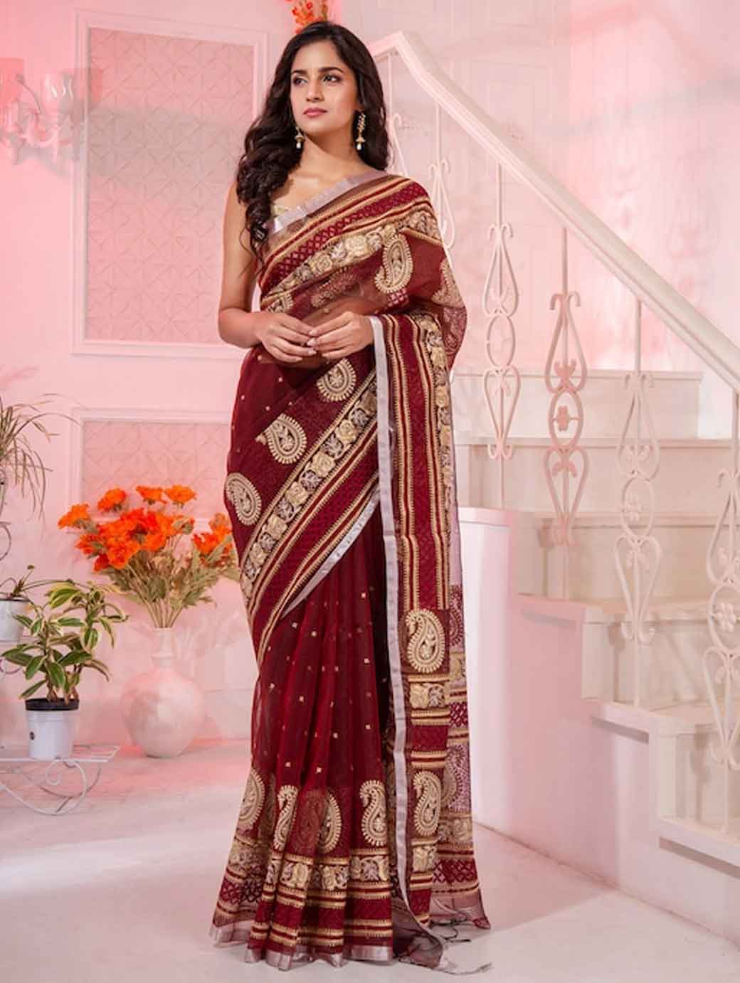 Maroon and gold-toned saree