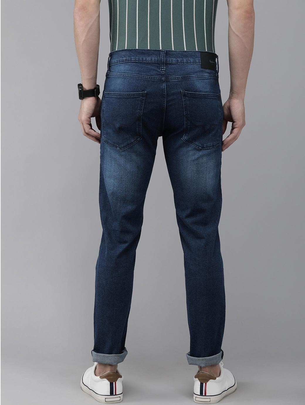 • Medium shade, light fade blue jeans